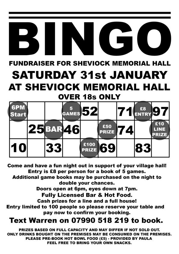 Parish Fun Day Bingo Date: Saturday 31st January 2026 Time: Doors open at 6pm, eyes down at 7pm Venue: Sheviock Memorial Hall Share this: Share on X (Opens in new window) X Share on Facebook (Opens in new window) Facebook Like Loading...